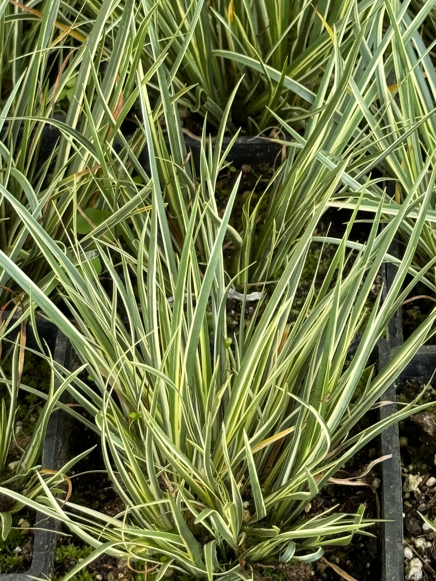 A very old Japanese cultivar, a true dwarf used mainly in bonsai work, but equally at home in the garden where clumps of grassy foliage in variegations of green and white can reach 6" tall. Slowly spreads in part shade to shade where moisture is consistent. Even tolerates shallow standing water. Also can be tucked here and there to hide the cracks. Frost hardy to -10F, USDA zone 6.