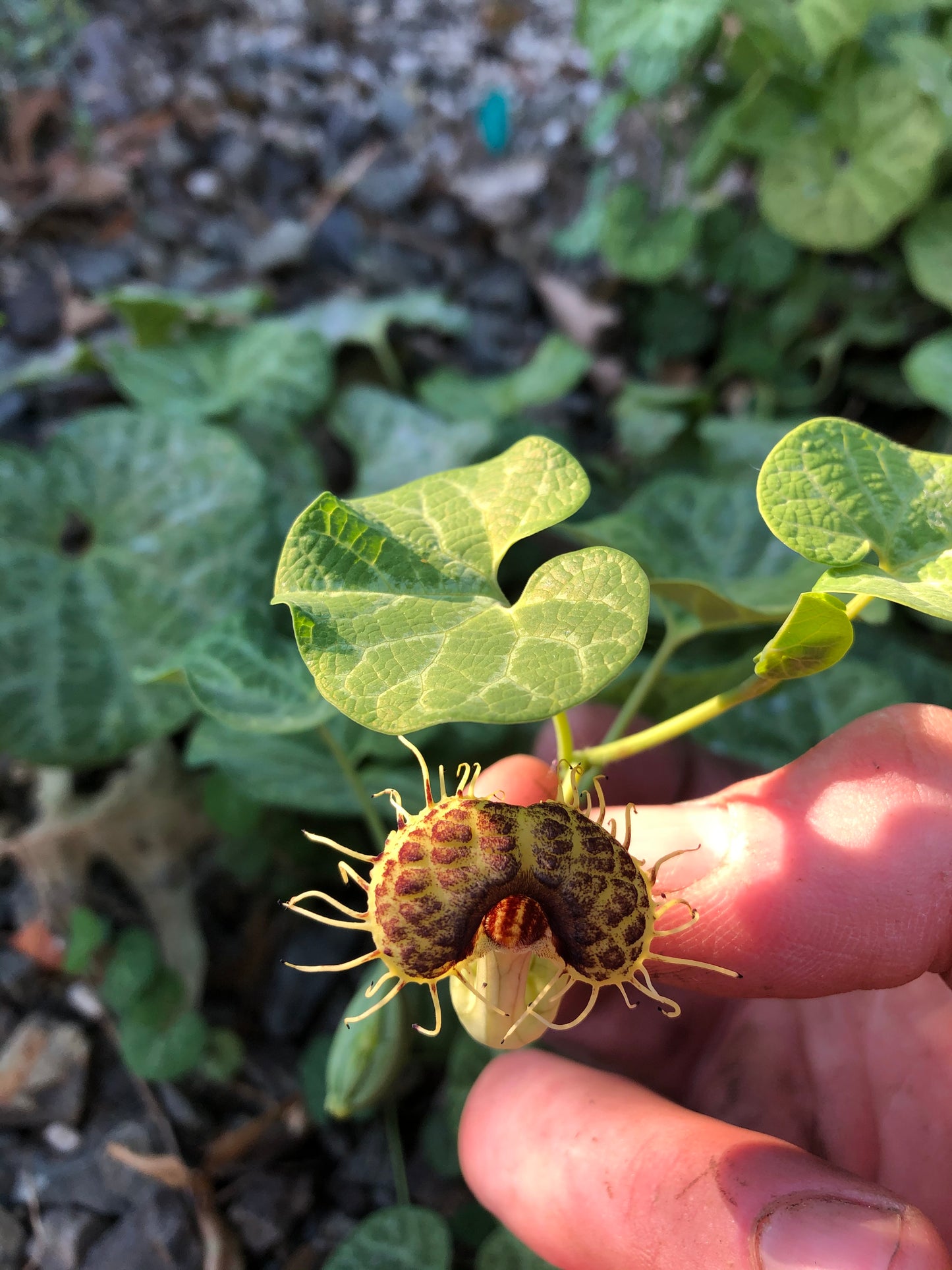 Small Dutchman's pipe from Brazil to northern Argentina, a prostrate, deciduous ground cover to only 6" tall and 2-3 ft wide, the leaves heart-shaped with prominent, pale, netting following the veins. The exotic flowers, produced all summer, are striking, strong, curved green tubes, 1" across, with long hairs and interiors that are purple-brown, veined yellow. Good for hanging baskets where the flowers can be seen. Average summer water in gritty or sandy soil in sun to part shade in hottest climates. Evergreen where temperatures only dip into the 20sF. Deciduous with good autumn color at lower temperatures. Root hardy in USDA zone 7.