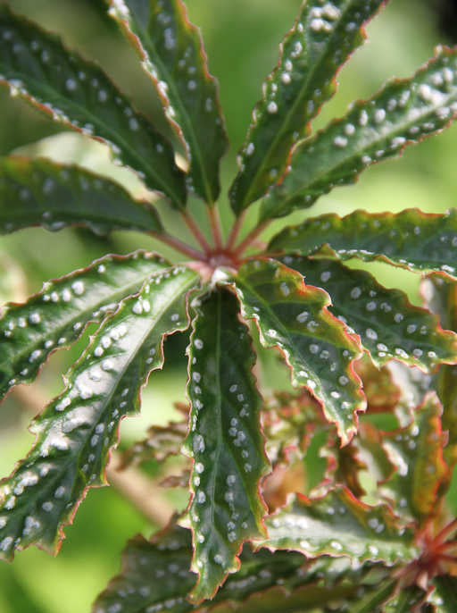 Very hardy begonia grown in gardens for many years. Dormant through winter, emerging in June with fuzzy red stems carrying palmate leaves, dark green speckled white. A very nice texture for the shady, woodland garden, in moist conditions -- but not too moist. A bit of drying before watering is welcome. Requires good air circulation as well. Found at 4-6,000 ft elevation in Yunnan, China, these are frost hardy to 0F, USDA zone 7.