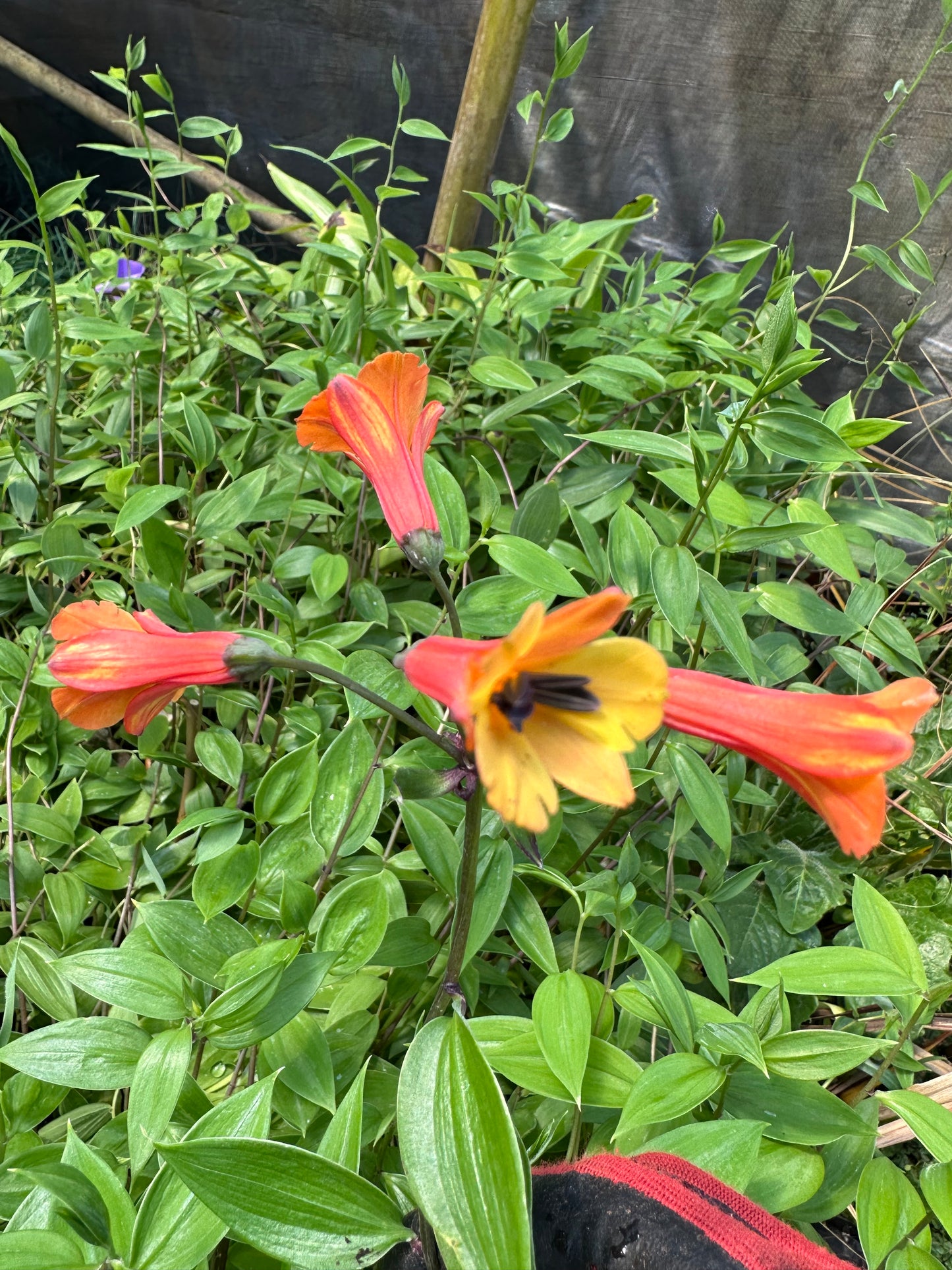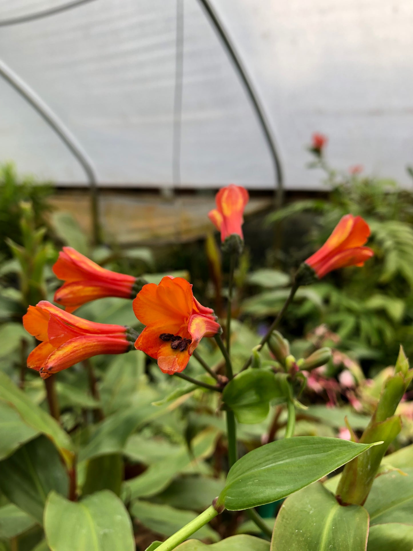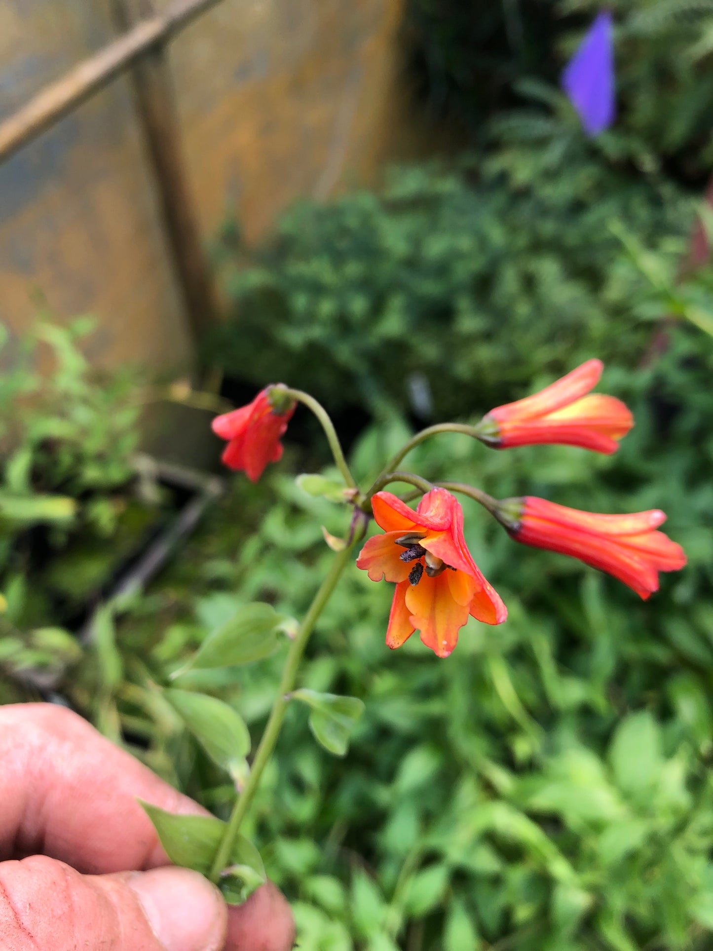 A bit of a botanical anomaly, this so far nameless cross, done by both Calvor Palmateer and Martin Grantham, has produced upright perennials with blue-green leaves and tubular flowers exhibiting shades of pink, orange, and even a little mauve. They have been non-seed producing clumpers in the garden and reliable for several years now, happy with bright light and a bit of summer water. Frost hardy to the bottom of USDA zone 8.