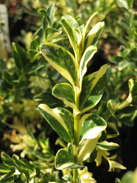 A collection from a lone surviving shrub in the shade of an ancient pecan in a North Portland "garden”, this 8 ft boxwood has a tall, rather narrow habit, with upright branchlets and a pleasing creamy-gold variegation throughout the leaves. Drought tolerant and vigorous. You should have one. We would like to see it used as good garden furniture. Considering its "habitat” it must be very drought tolerant and, from the original plant's appearance, able to withstand occasional pruning with chainsaws. Frost hardy to -10F, USDA zone 6, at least.