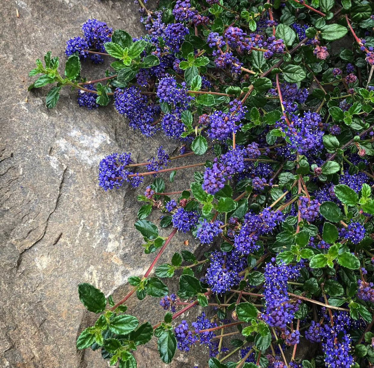 A broadleaf evergreen shrub or groundcover with green foliage and cobalt blue spring flowers. Attractive to birds, bees, butterflies and beneficial insects. Best in full sun to part shade inland in well drained soil. Drought tolerant once established. to 2' tall x 4' wide. USDA 8a.