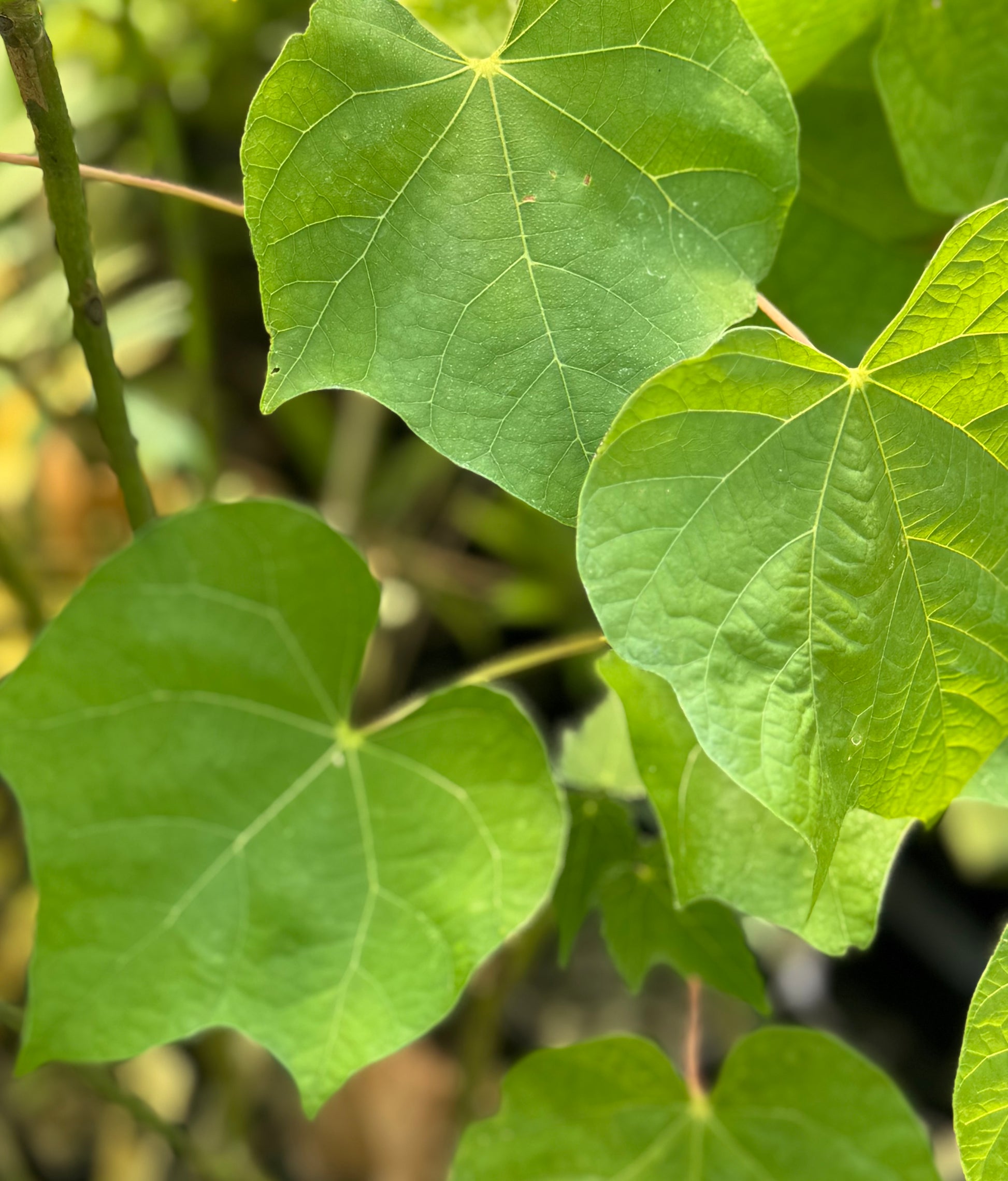 The parasol tree, native of southeast China to Japan and a member of the chocolate family, is vigorous, reaching 20-30 ft in the garden with huge leaves -- 18" to even 2 ft across, like giant maple leaves - and few but thick branches on a stout trunk of bright green bark. Perfect for the tropical garden. Small, greenish flowers and lemon-yellow fall colorare added attractions. Prefers evenly moist soil and good drainage in sun to part shade with a little organic matter and regular summer moisture. Though somewhat drought tolerant, the leaves would be smaller. Too seldom offered. Frost hardy in USDA zone 8 with many specimens found growing in zone 7. A freezeback plant in USDA zone 6.
