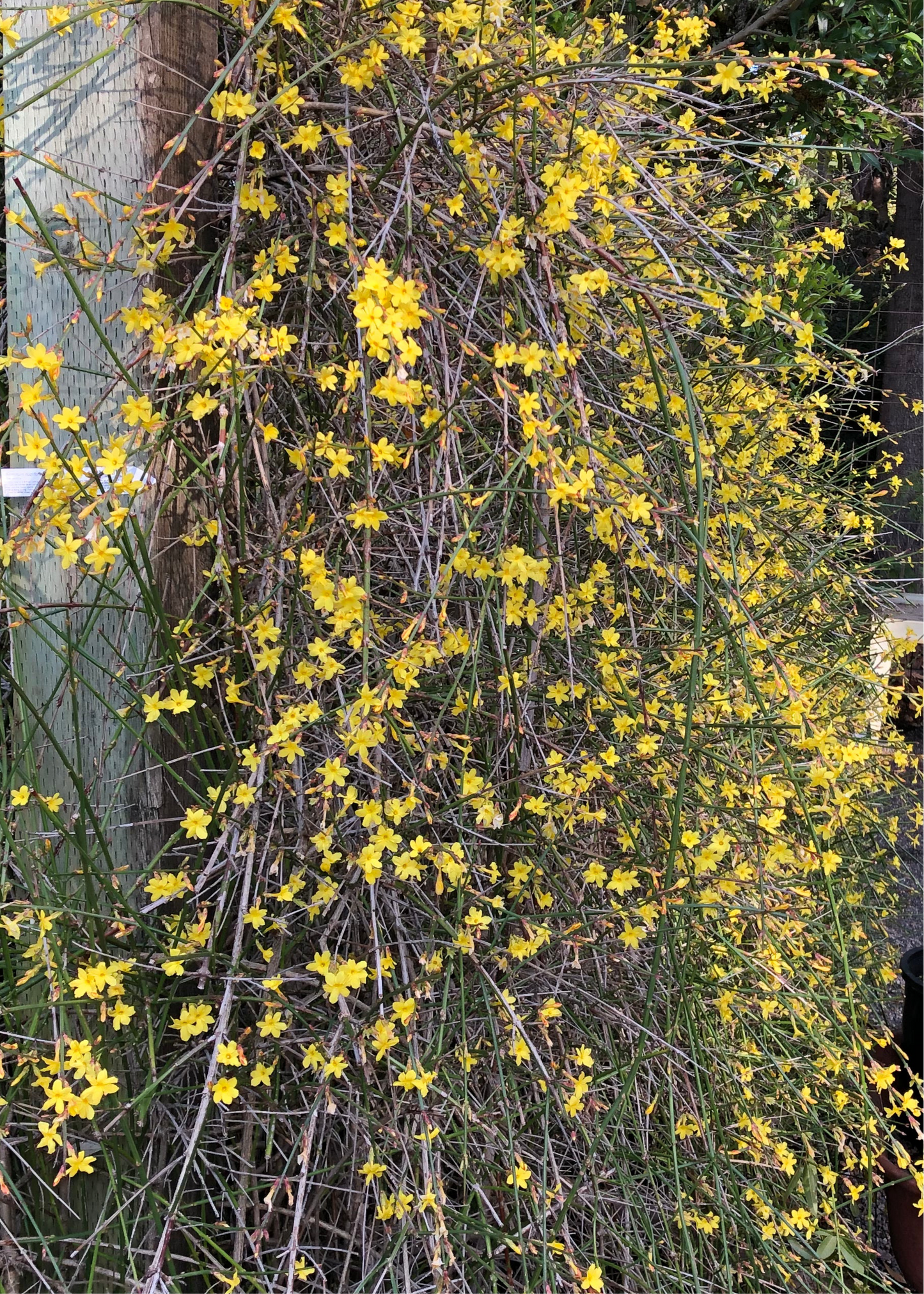 Shrubby vine, to 4-8 ft tall, with arching branches that can trail along the ground, rooting as they go, especially in rich soil. Can be trained as an upright growing vine, to 10-15 ft tall or cut back to 18" or so to refresh after flowering. Either way the naked stems remain green through the winter and produce barely fragrant, bright yellow flowers in late winter to early spring. Full to part sun with normal summer water for best flowering. Frost hardy to -20F, USDA zone 6. Great for winter cheer and hummingbird food.