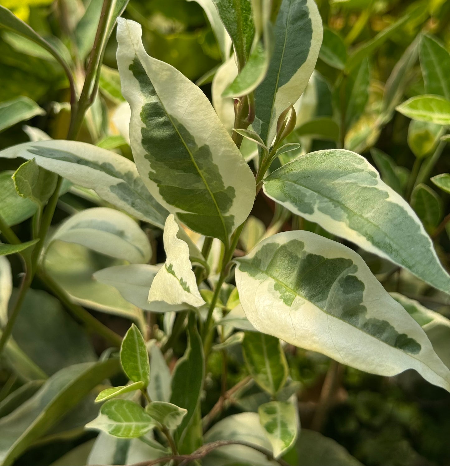 Superb indeed, this Ligustrum cultivar was found by Sean Hogan in Greenwich, England. Excellent cream and light green leaves are awash in May with fragrant panicles of white flowers. Evergreen, these are easily maintained as large shrubs or small trees, to 12-15 ft tall, useful as single specimens or as a screen or hedge. Happy in full sun to light shade, although best-looking in full sun. Prefers good drainage and regular summer water, drought tolerant once established. Rewarding in that difficult spot. Hardy to USDA zone 6.