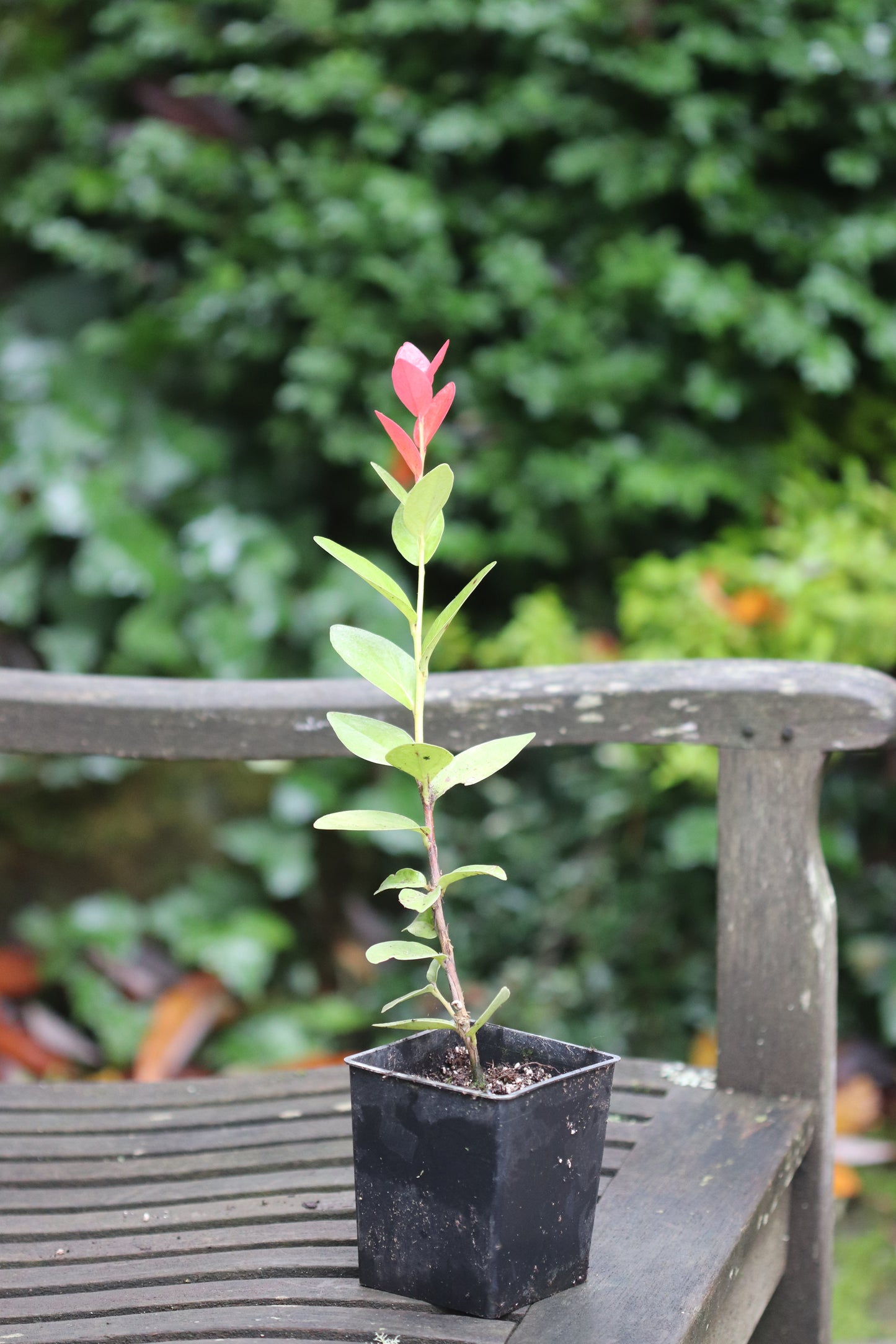 Another curious caudex forming tropical blueberry relative. This native to the cloud forests of the eastern Central American Sierra has leathery evergreen leaves and brilliant red in new growth and 2 inch coral tubular flowers borne at the leaf axils along trailing stems. The trailing form lends itself to a hanging basket or trellis training. Likes cool well drained soil with regular water and ample humidity sun to afternoon shade and frost free conditions. USDA zone 9b.
