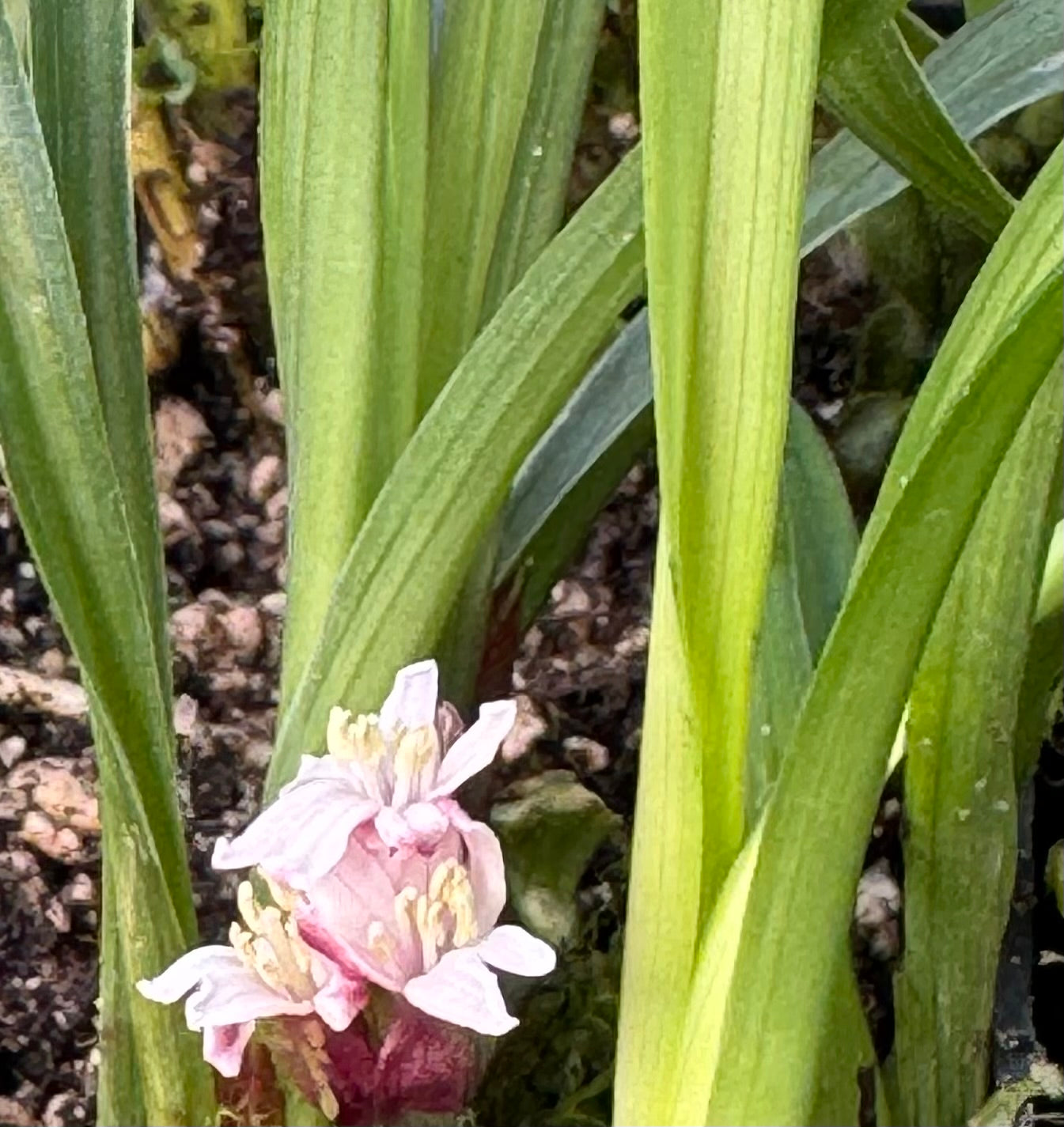 Handsome, evergreen woodland perennial, originally collected by the Wynn-Jones' of Crug Farm, and closely related to lily of the valley. Tufts of narrow, grass-like dark green leaves form a dense carpet of upright dark foliage to around 8" tall. August-October, tiny pale pink flowers appear short stems, and are closely held to the base of each leaf tuft, berries follow. Site in shade to part shade in well-drained, amended soil with regular summer water. Hardy to USDA zone 7.