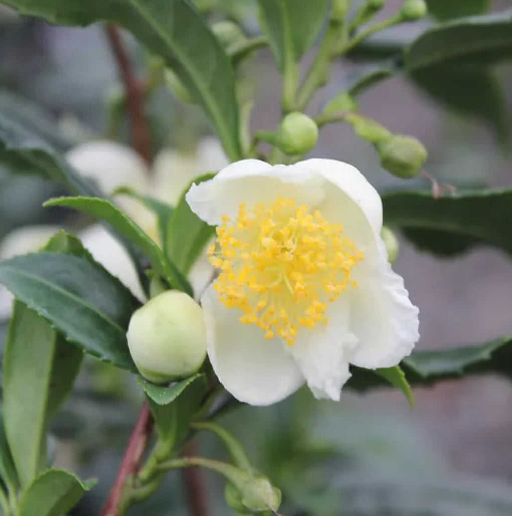 Historically significant evergreen shrub or small tree native to East, South and Southeast Asia with light green leaves that turn darker as they age and small, delicate white flowers. Young leaves contain around 4% caffeine and varieties of the species are used to make the world's finest teas. In Asia, leaves are harvested in "flushes" of new growth which occur up to three times a year at higher elevations. Full to part sun and rich, moist soil. Prune shrub between 3-6ft in height to aid in leaf cultivation. Frost hardy to at least USDA zone 7.