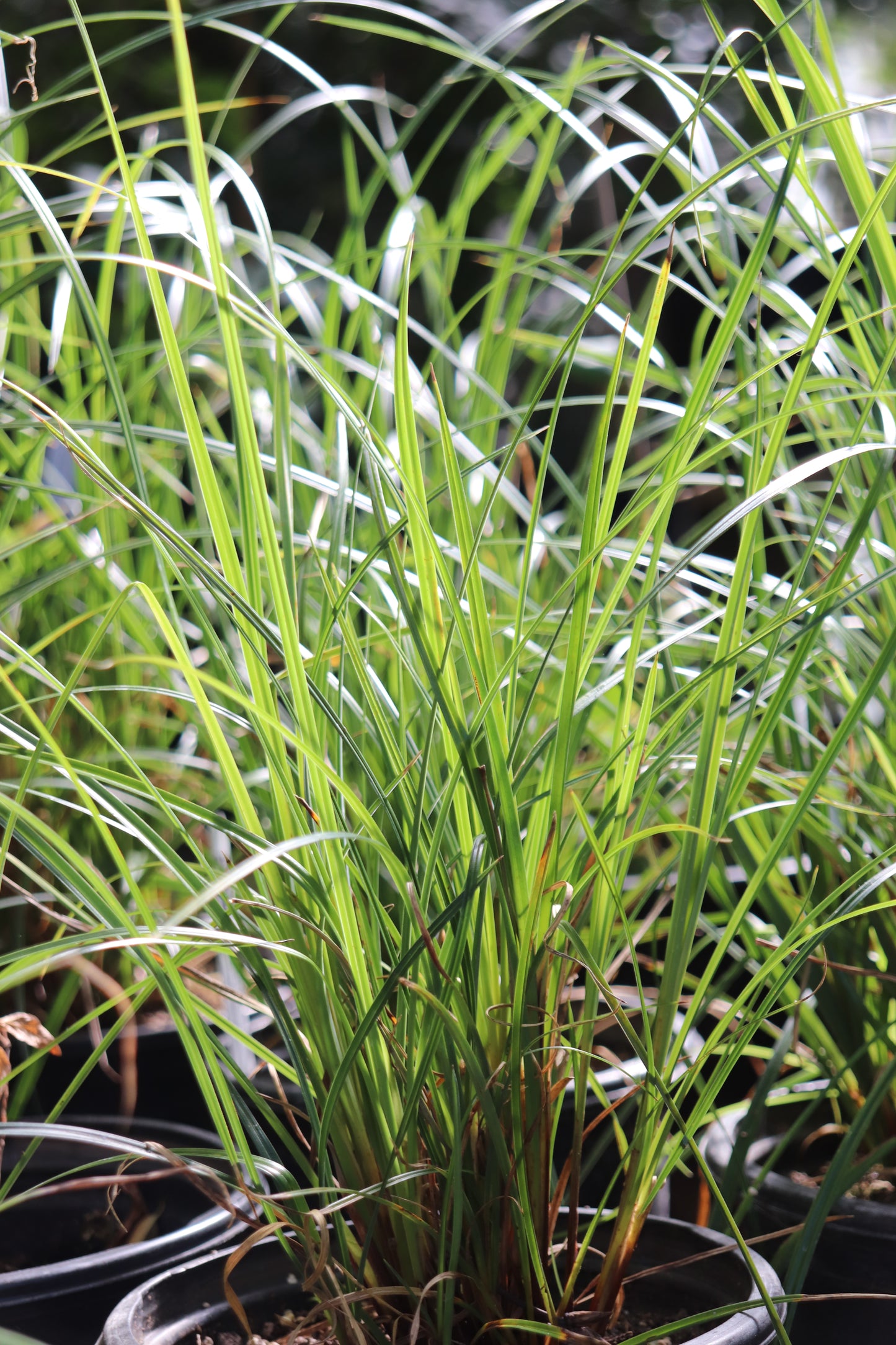 Useful and durable sedge for full sun to partial shade, tolerant of moist soil or even standing water, also adapted to summer drought. Grassy leaves are evergreen, growing in small bunches to 18" or more spreading by underground rhizomes to form large clumps. Flower spikes are purplish black and stand above the leaves in summer. Great for erosion control and seasonally wet bioswales. Frost hardy in USDA zone 6.