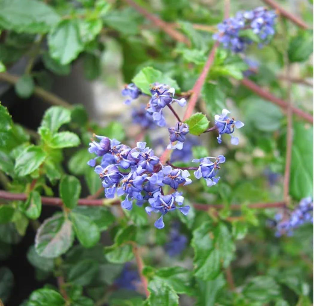 Superb, ground covering Ceanothus, a hybrid between C. griseus and C. foliosus. A University of California Berkeley selection by Roger Raiche, this tiny leaved, dark blue flowered, evergreen shrub rarely exceeds 2ft in height, though spreads out to 6ft or more. Full sun with little or no summer once established. Frost hardy to USDA zone 8.