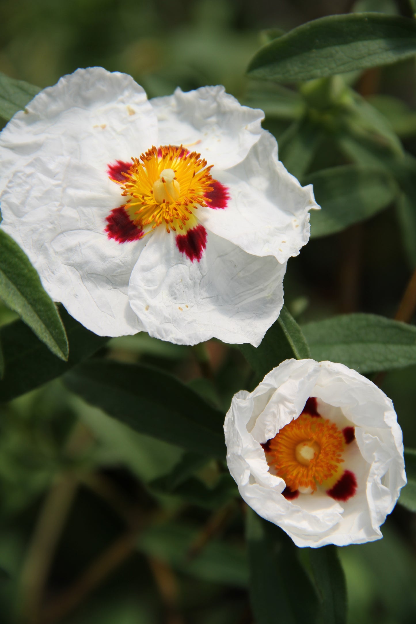 Low-growing, evergreen shrub, to only 3ft tall and spreading to 3ft or so. This exuberant spring bloomer produces large, pure white flowers with a cool red dash at the base of each petal. The foliage is handsome as well and gives off a pleasant resinous scent in the summer. For full sun and well-drained soil with little summer water once established. Frost hardy to USDA zone 7 with good drainage.