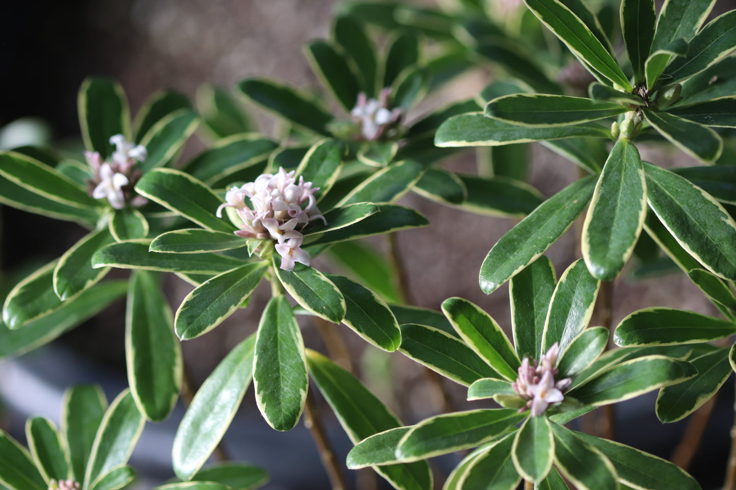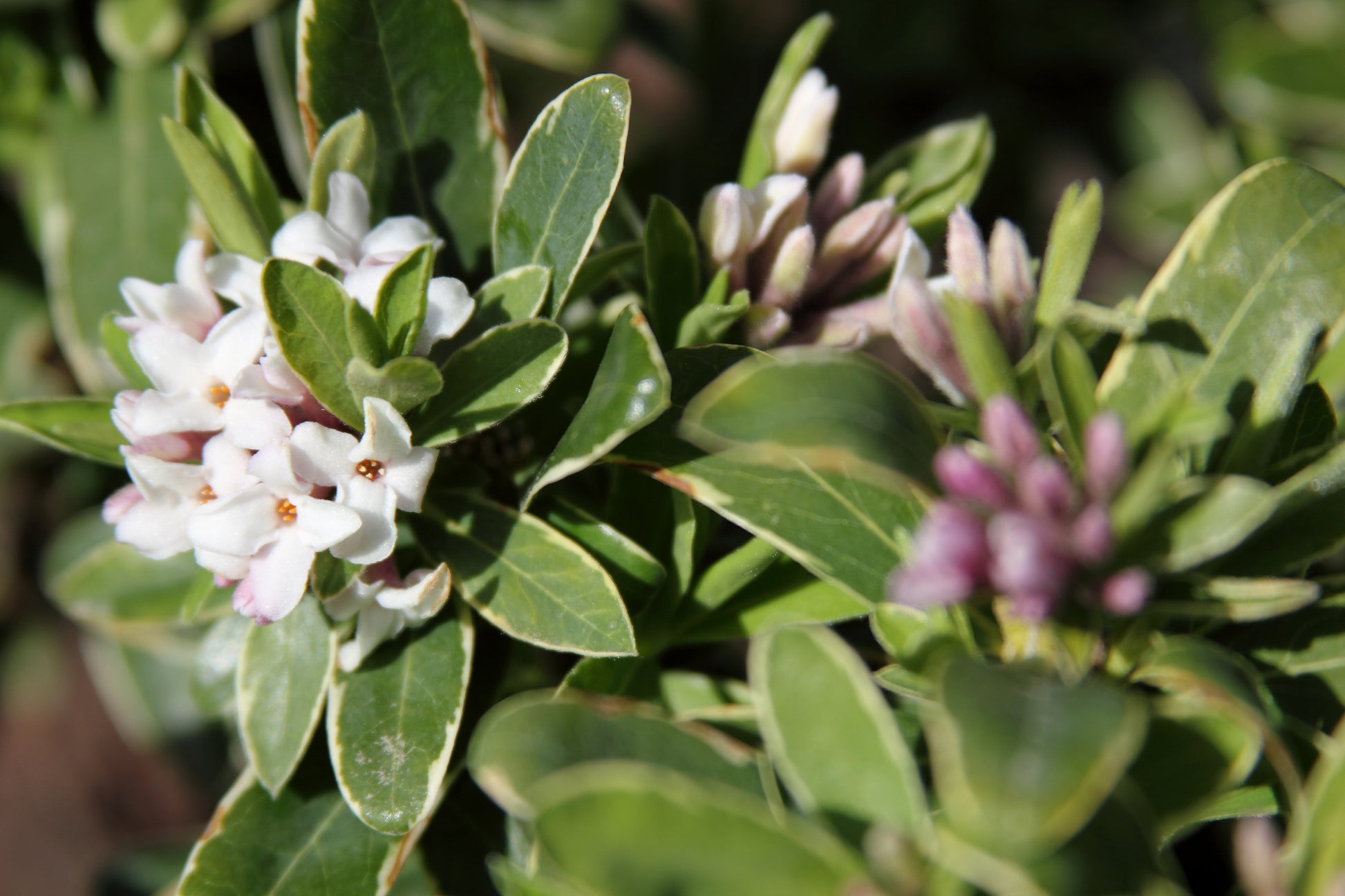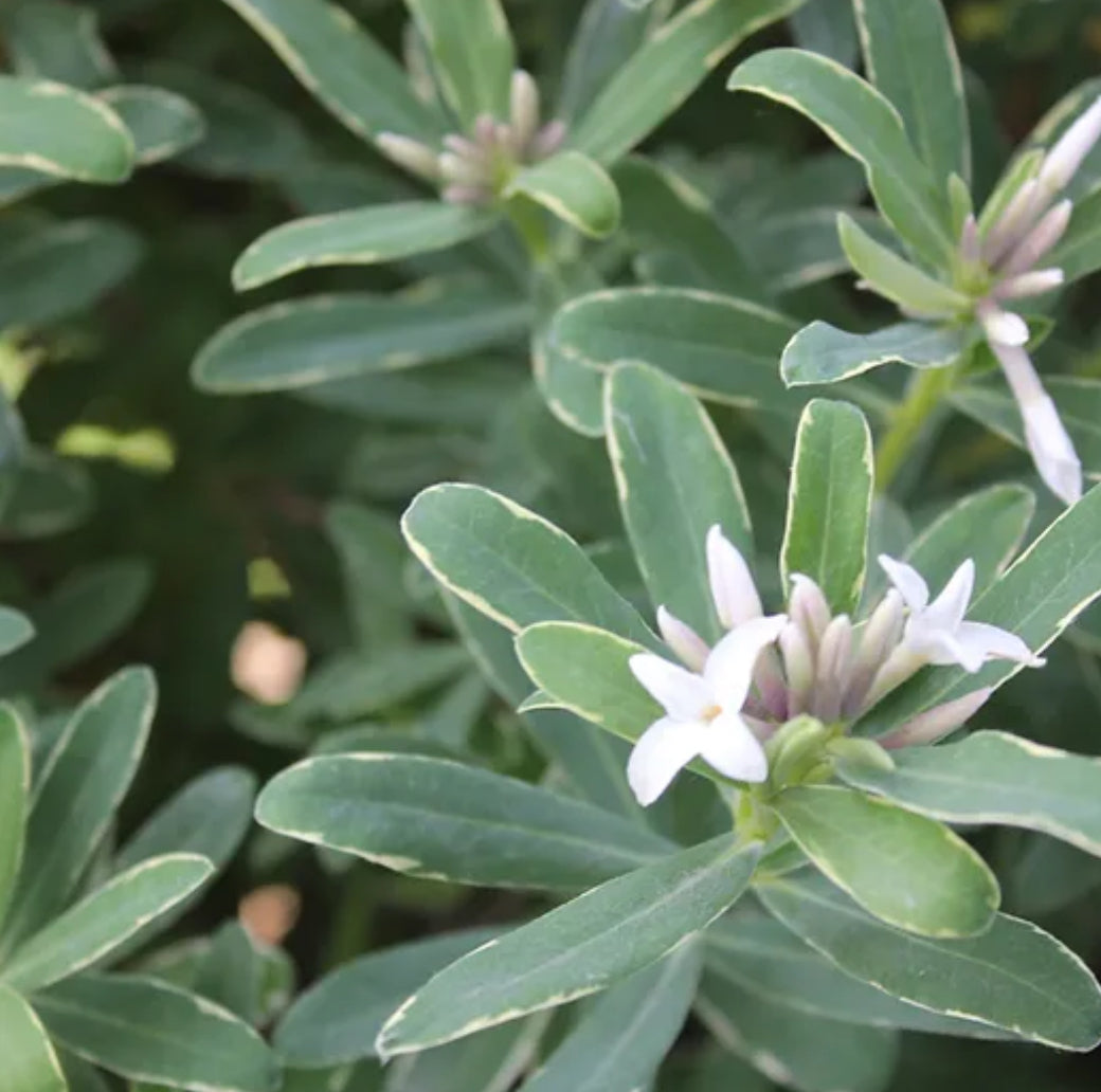 Easy daphne with semi-evergreen variegated foliage and fragrant flowers over a long, long blooming season - white, faintly blushed pink in clusters on the stem tips. Shrub to 3-4ft tall and 5-6ft wide in 10 years. Full sun for the best flowers, and well-drained soil. Provide summer water for two years to establish and little after. Evergreen in upper USDA zone 8 and frost hardy in USDA zone 6.