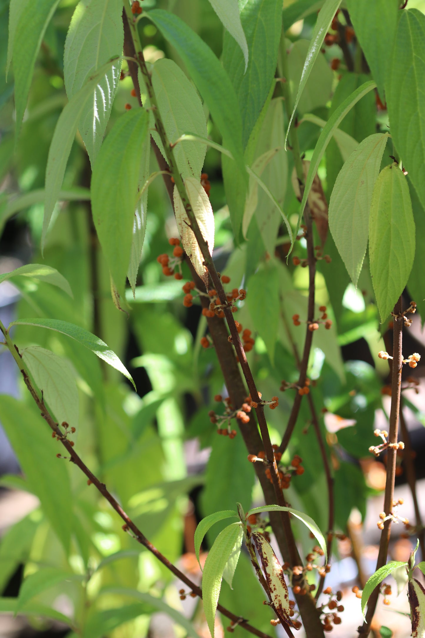 Tall nettle relation that came to us from Shanghai. Hardy in our Portland garden for 7 years. 10ft or more with netted leaves that are dark on top and have reflective, white undersides. Site over pond for max effect. White flowers appear on the stems followed by orange berries that are edible, eaten raw in Taiwan. Sun to part shade with average summer water. Frost hardy in upper USDA zone 8, resprouting from the ground.