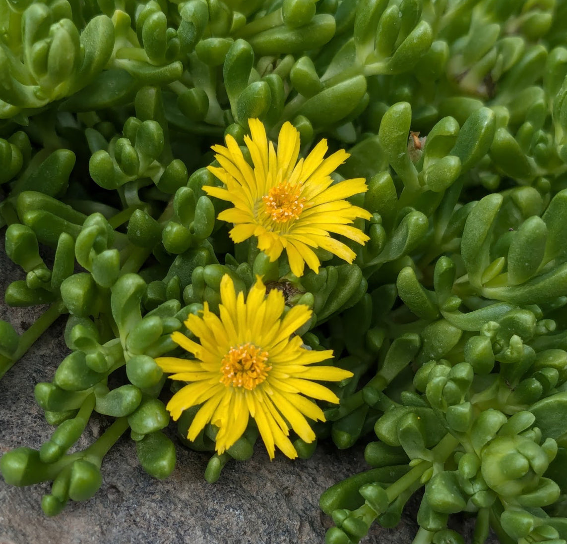 Mat forming succulent covered in summer with bright yellow, daisy-like flowers. To less than 6" tall forming low mats of evergreen leaves that turn bronze in winter and spread to 15" wide and beyond over time. A good ground cover for the sunny garden where drainage is excellent and little summer water is provided. Lovely in a rock garden or spilling over a rock wall. Frost hardy to -30F, USDA zone 5. Attracts butterflies and is said to be resistant to deer.