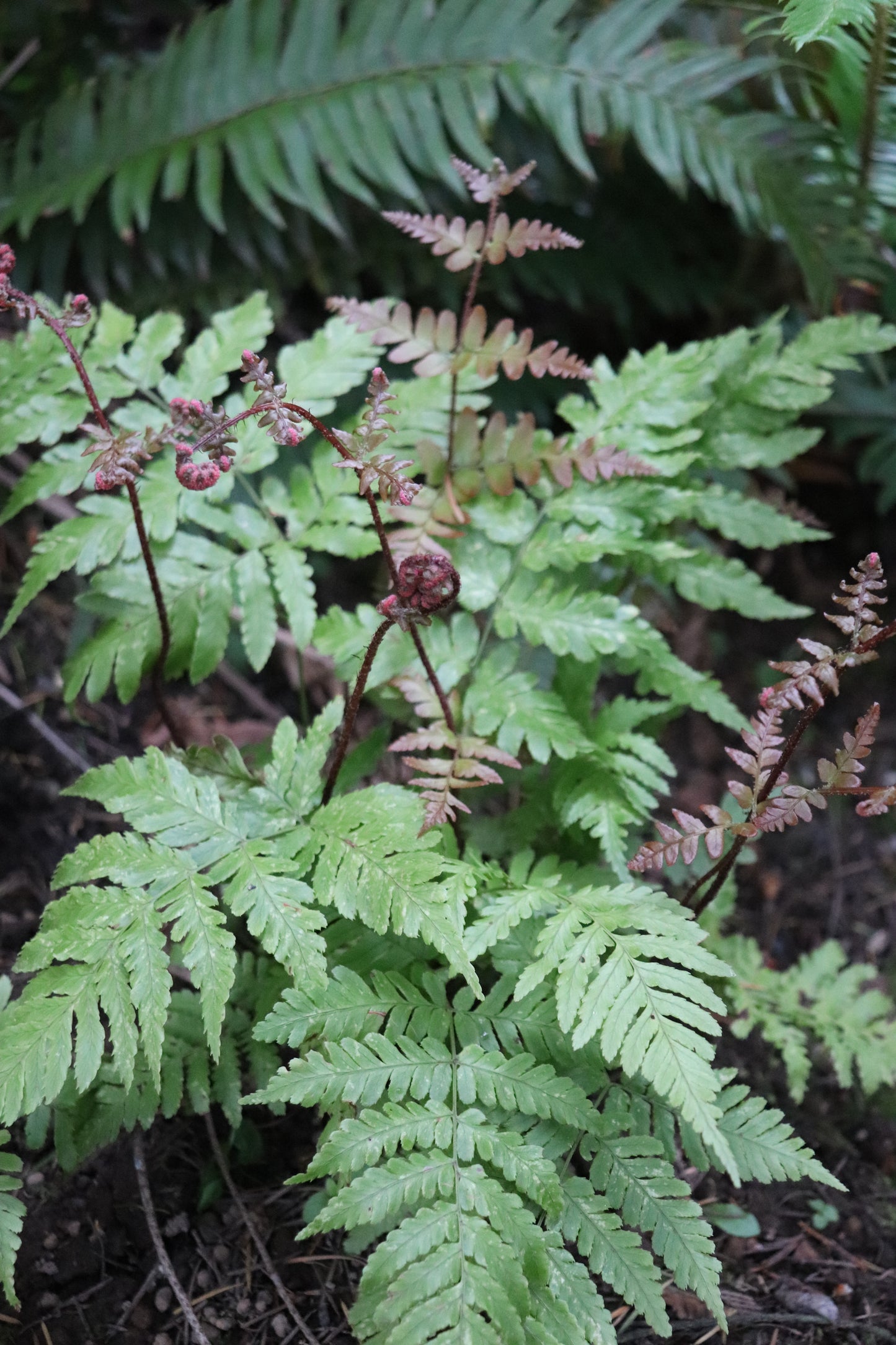 A small compact fern, great for the shady or woodland garden, with wonderfully colored foliage that begins with coppery new growth, greening in summer and re-coppering again in fall. Evergreen through most winters in the Pacific Northwest, recovering easily from any unusual temperatures. Plants are 24-36" tall by 15" wide and do well in part to full shade. Regular moisture is best. Frost hardy in USDA zone 5.
