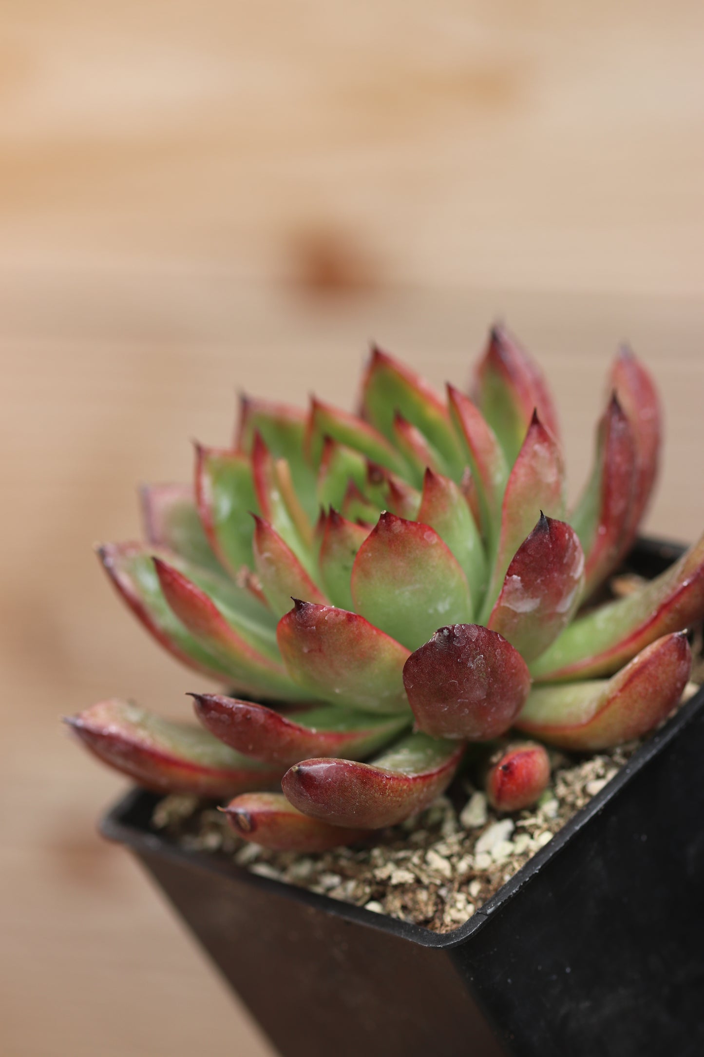 Sweet and very cold hardy echeveria with fleshy leaves, light green blushed red on the tips and edges. Round rosettes can reach 6" tall by 1ft wide, topped by red flowers with a yellow tip in spring through early summer. Tolerant of sun or shade preferring lean, well-drained soil and only occasional summer water. Frost hardy to 15F, or so, mid USDA zone 8 so possible in the ground. Great in containers.