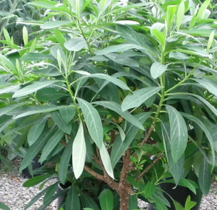 Amazing daphne relative, deciduous, blooming in February with pendant yellow, intoxicatingly fragrant blooms on handsome, bare stems. Long, tropical-looking leaves follow. Reaches 5ft tall and as wide in full sun to half shade with summer water. Frost hardy in USDA zones 7-9. Has proven to be hard to find as of late, get em' while you can.
