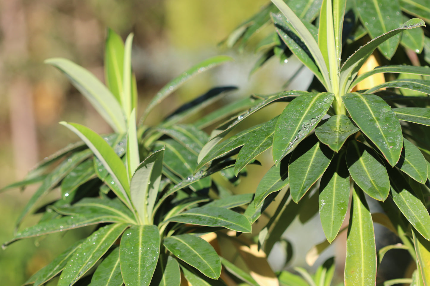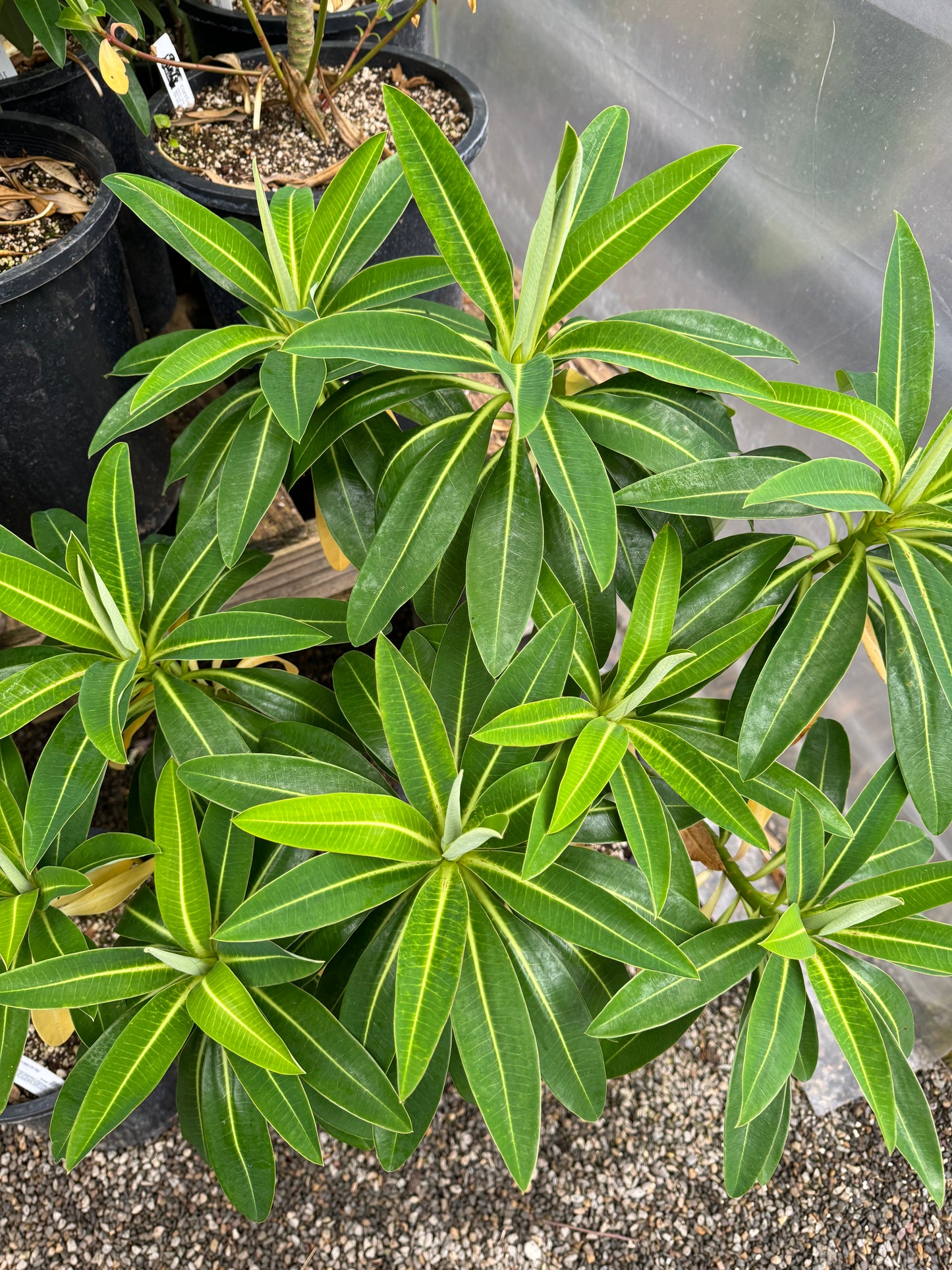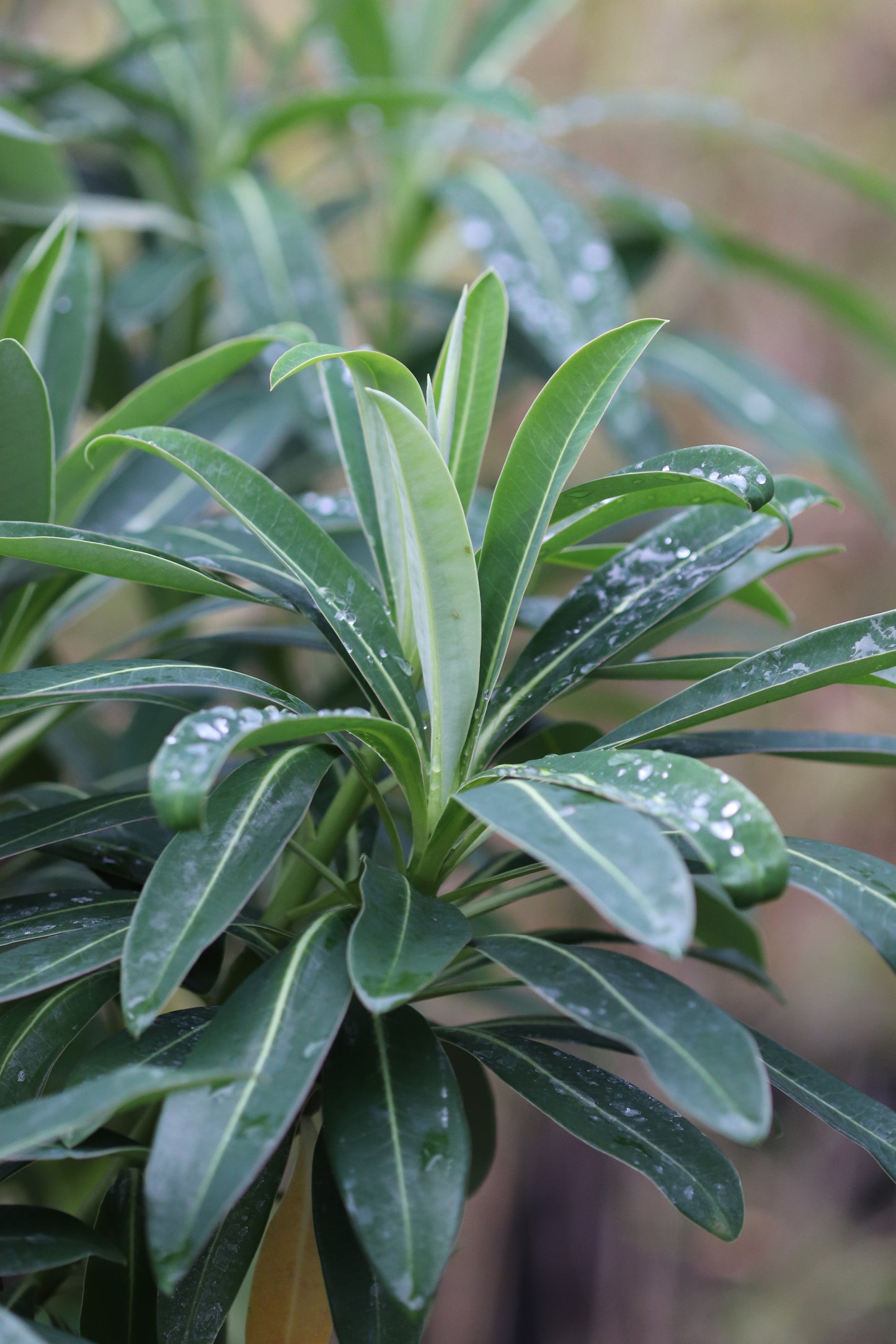 Striking evergreen euphorbia, a selection of the hybrid between Euphorbia mellifera and E. stygiana, both handsome in themselves. This one was chosen for its vigor, height up to 5-6ft tall by 8 ft wide, long narrow leaves with a striking white central rib and brown, honey-scented flowers in sharp contrast. Enjoys full sun and well-drained soil. Frost hardy into the upper teens F, uppermost USDA zone 8 so best in a protected spot where temperatures regularly drop below 20F, or kept in container and provided winter protection.