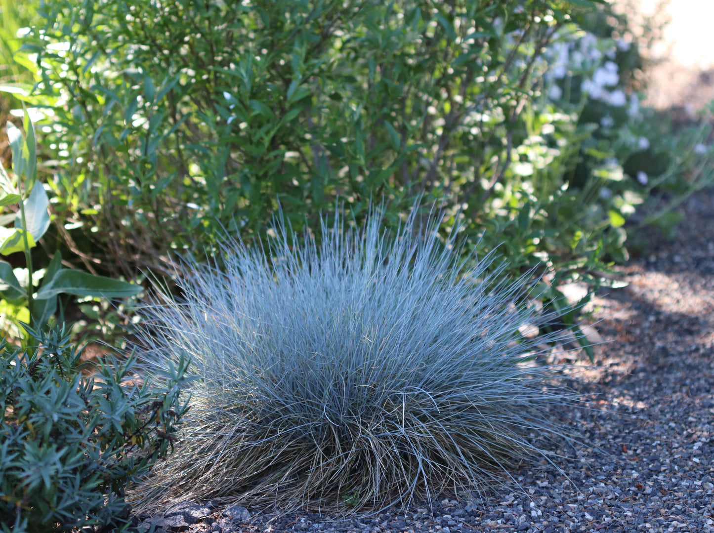 A selection of the classic blue fescue that retains its intense powder blue color throughout the summer. Compact mounds to 9-12" high and 18" wide are topped in summer by upright flower stalks aging in late summer to an attractive buff tan. Drought tolerant once established but occasional summer water is beneficial. Full sun to light or afternoon shade in well drained soil. Great planted with other summer drought plants and in containers. Divide periodically to maintain vigor. USDA zone 4.