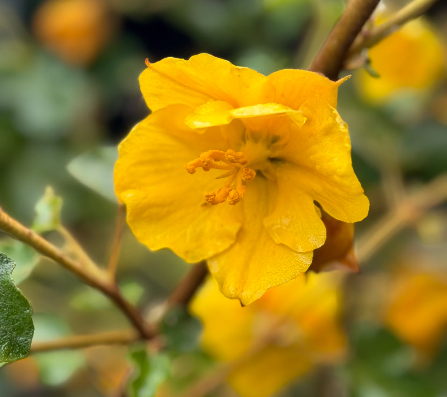 As if the wonderfully fuzzy leaves weren't enough, deeply saturated, 2-3" golden yellow flowers cover this beauty all summer long. HEAT, SUN, DROUGHT... it thrives on them, demands them, won’t do well without them. This clone to 10-15ft wide, 12-20ft tall or so, though can be pruned smaller. Avoid watering after the first summer. Fuzzy little hairs on the leaves are irritating to some. USDA zone 8-10.