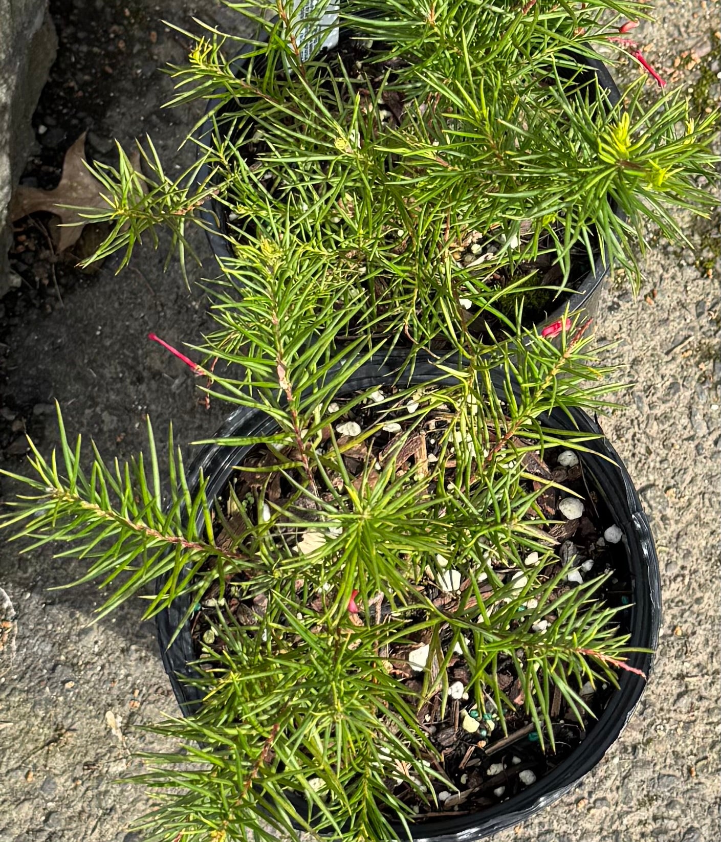 Graceful 4-8 ft shrub with needle-like foliage makes a lovely backdrop for the spider-like clusters of rosy red flowers in winter through spring and occasionally throughout the season. As with other grevilleas, full sun, mineral soil, and little fertilizer, especially those containing phosphorous. Appreciates occasional summer water, though actually quite drought tolerant. Hardy to USDA zone 8/9, when kept out of the windiest sites.