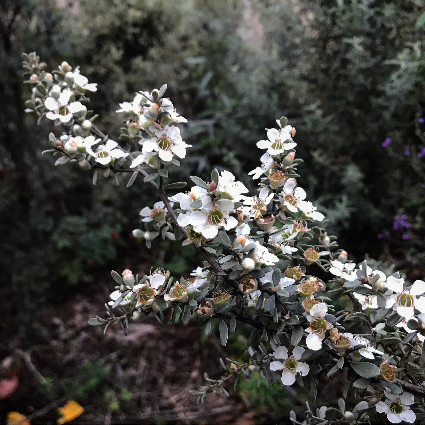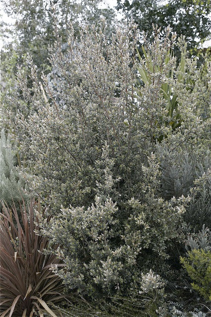 Our clone from good friend Kevin Hughes, most recently of Hampshire's Spinner's Nursery. A shrubby tree to 10 ft or so with thick, gray-green leaves with a silver shimmer. In midsummer, the foliage is absolutely smothered with 3/4" whitish pink flowers, lasting a very long time. A must have for the proper garden. Frost hardy through the single digits F, USDA zone 7.