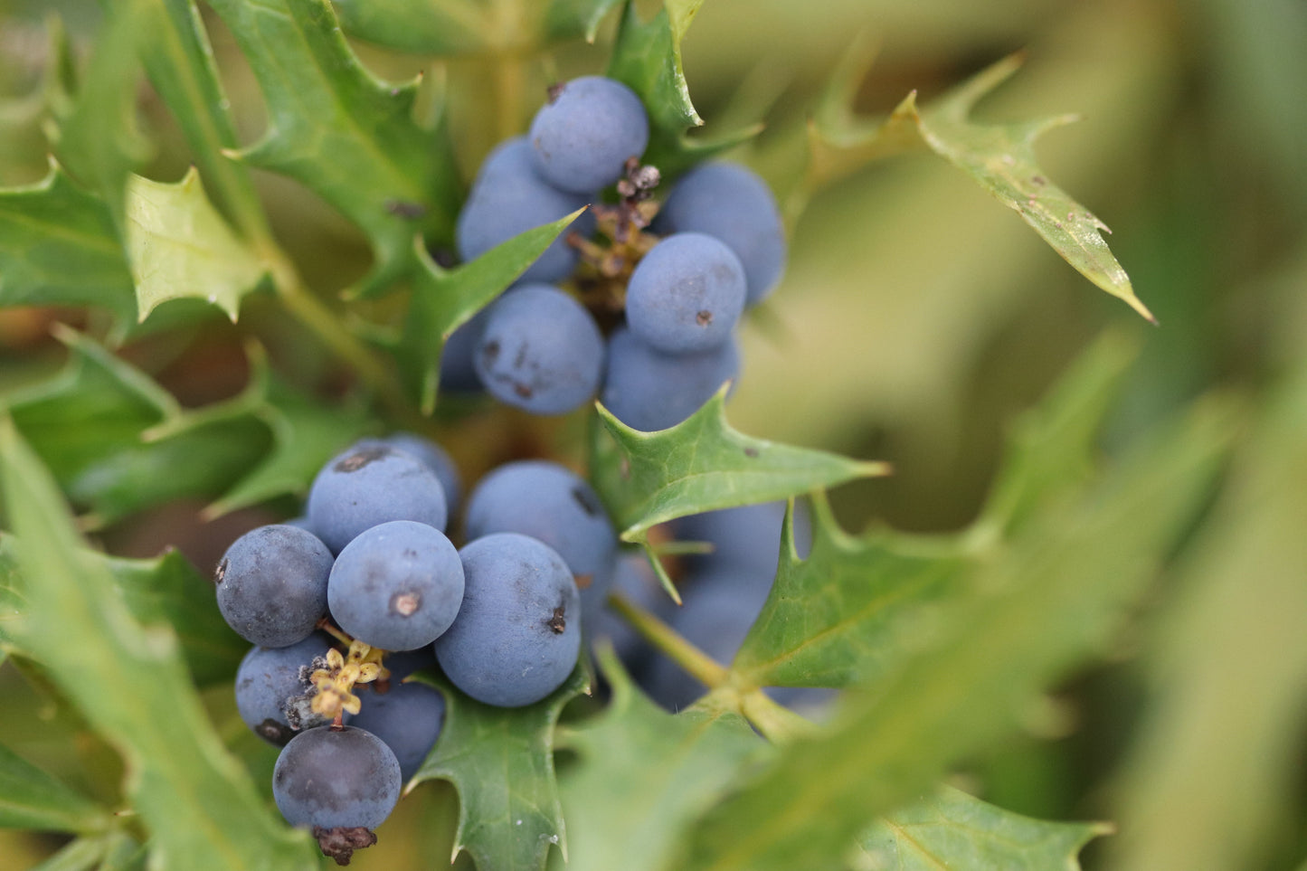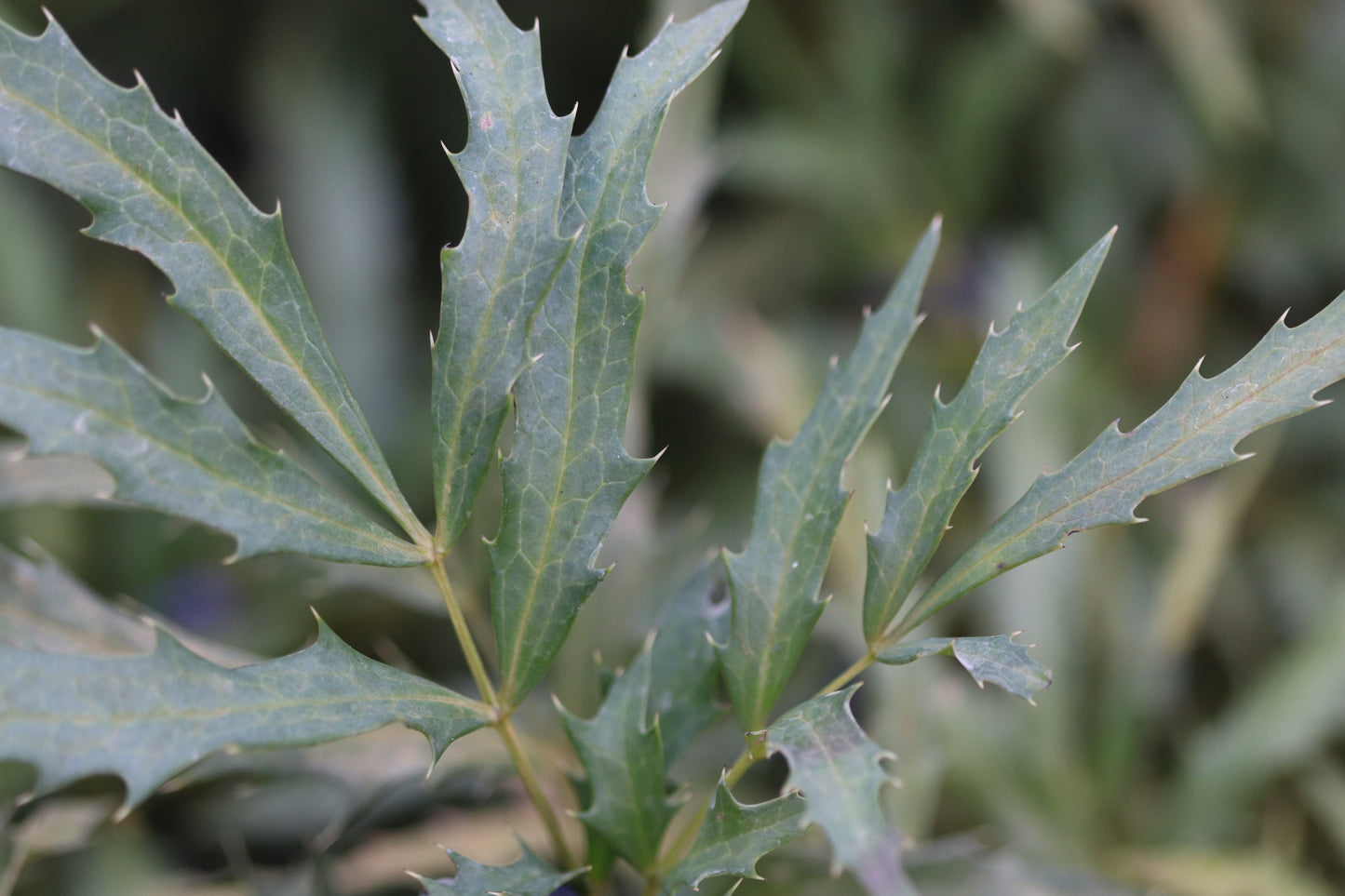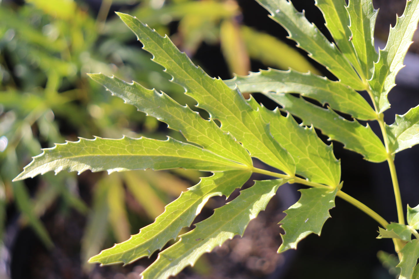 This Chinese mahonia is elegant in its simplicity. Unbranched stems rise 3 to 4 feet with fern-like compound leaves, the leaflets narrow and green above, more yellow below. Clusters of lemony yellow flowers appear in late fall followed by purple black berries. Spreads slowly. Thrives in shade or sun, prefering more sun in colder climates, and prone to mildew in Pacific Northwest shade. Supplemental summer water in dry areas. Frost hardy in USDA zone 8; root hardy in zone 7 with protection.