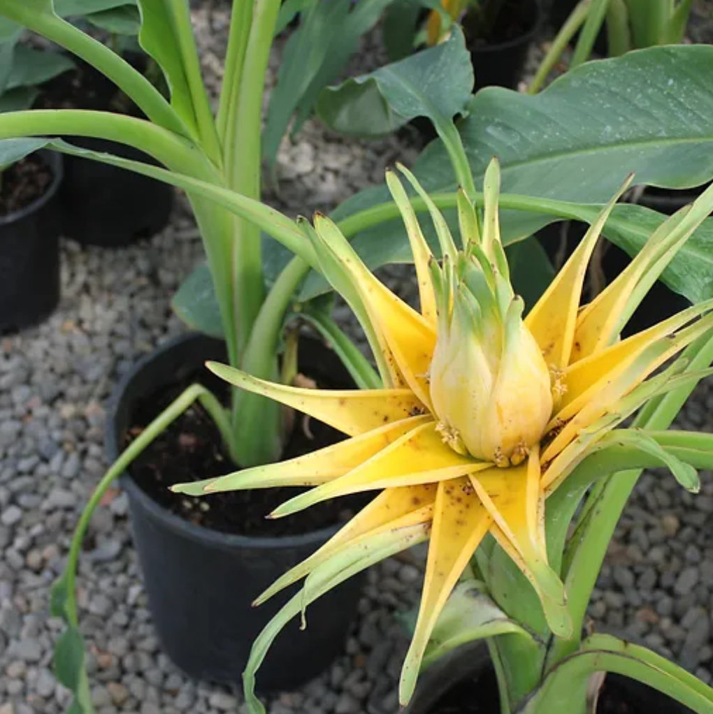 This banana relative is more shrub-like than its kin, with sprays of 3-6 ft tall stalks of gray-green foliage until frost. Once its feels established, a bright yellow flower the size of a softball will appear and remain all summer long, sometimes producing tiny little bananas. Flowering shoots die back to be replaced with new, vigorous stems. Best in sun to part sun with regular summer water. Frost hardy to 10F, USDA zone 8.