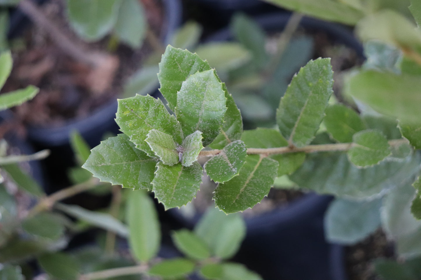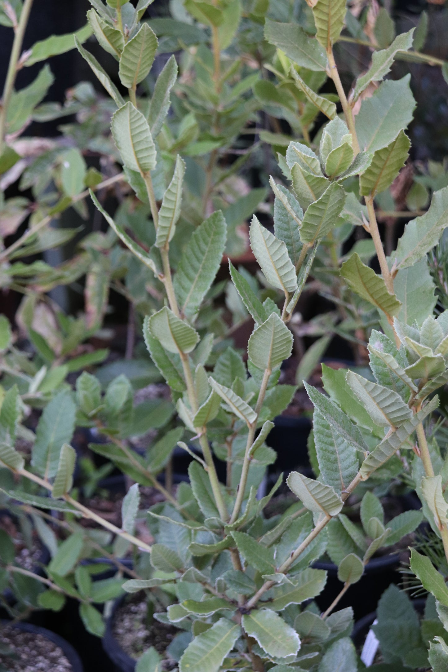 This west coast native tan oak is a handsome and easy addition to the summer-dry garden or street-side landscape. Sword shaped leaves are dark green with a silvery underside. Tall, stately evergreen to 50 ft or more. Full to part sun, no summer water once established. These plants from acorns gathered in southern Oregon’ Siskiyou Mountains. Hardy to -5 degrees, USDA Zone 6b.