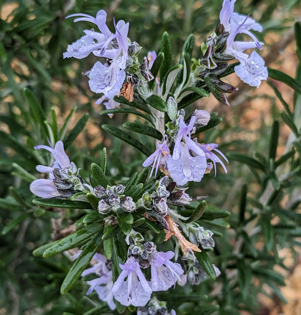A rosemary selection both handsome and useful in the kitchen, this with wide leaves and large medium blue flowers in late winter and early spring. Makes a nice evergreen hedge, to 3 ft tall x 2 ft wide. Full sun and lean well-drained soil with little or no summer water once established. Shear in late spring for a compact presence. Frost hardy to 5F, mid USDA zone 7.