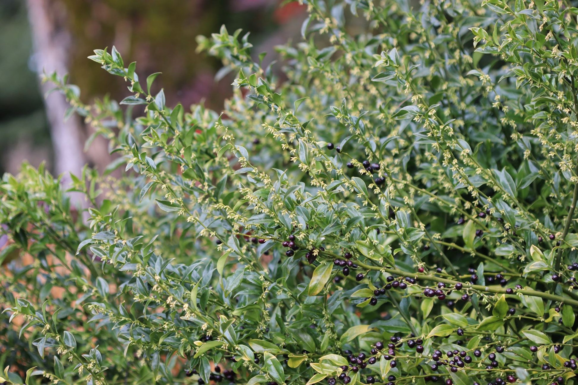 Evergreen shrub, to 4-6 ft, quietly fills an empty spot in part to dense shade and bursts forth in winter with a remarkably sweet fragrance from an abundance of small, white, thread-like flowers. Red berries turn black and remain through summer. Branches root easily providing more plants for more winter fragrance. Regular summer water. Frost hardy to 0F, USDA zone 7.