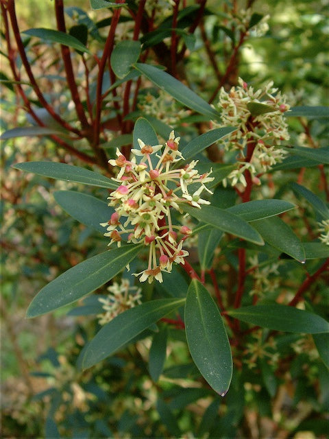 Fascinating group of plants ranging from southern Australia to South America with a couple as far north as Mexico -- all most closely resembling the northern hemisphere genus illicium. Drimys lanceolata, most often a shrub though can reach 8-10ft or more, is most striking where the brick-red stems and leaf bases can be observed up close. The leaves are shiny and narrow -- to 2" -- with mostly spring clusters of lightly honey scented white flowers and clusters of black berries that have, historically, been ground and used as peppercorns. We have found the leaves ( just a few) to be a wonderful, spicy addition to salads -- though our plants are mostly for external use. Would prefer regular summer water. Not a lover of great heat and humidity or freezing, drying winds, but superb along the Pacific Coast where temperatures seldom fall below 15ºF, mid USDA zone 8; has survived close to 0ºF, zone 7, with protection.