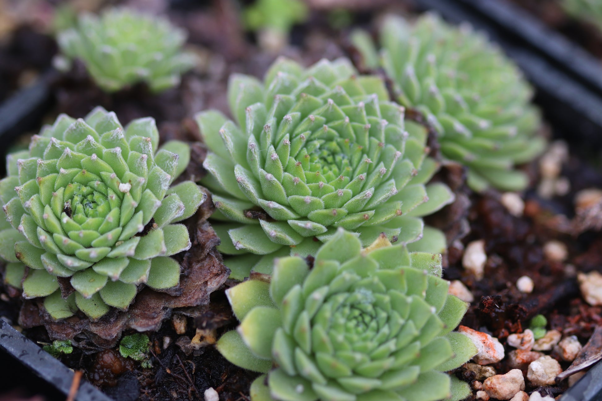 Amazingly variable and useful evergreen succulents from mostly limestone ranges of Europe, both species and selections abound many originating from here in the Pacific Northwest. From small cobweb clusters to large glossy rosettes in a range of colors, flowering in early to mid summer. Great in containers, troughs and along path edges. Dappled shade to sun in any decently drained soil. Periodic summer water where dry. All hardy in USDA zone 5, and many even hardier.